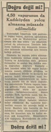 Yalovadan İstanbula 2,30 postasını yapan vapur, Adalara uğradıktan sonra 4,50 de Kadıköyüne geliyor. Oraya bir kaç yolcu ya çıkarıyor, yahud da çıkarmıyor. İskelede bekliyen halktan hiç kimsenin binmesine müsaade edilmediği için hemen kalkıp gidiyor.