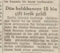 Zeytin ihracatı başlamış olduğundan fıçılar bu işe tahsis edilmekte, balık sevkıyatına fıçı bulunamamaktadır. Bu yüzden Romanyaya yapılan balık ihracatı durmuş gibidir. Dün balıkhaneye 15 bin çift torik gelmiş, çifti 70 kuruştan satılmıştır. İtalyaya Balık gönderilemediğinden ve diğer devletlere yapılan ihracatta buz sıkıntısı çekildiğinden balıkçılar dün akşam balık avına çıkarılmamıştır.