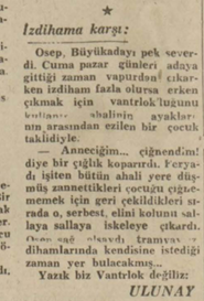 Yol müddetinden de kazanırım, diyordum. İstanbula inerek Maçkaya yerleştim, şimdi görüyorum ki, benim hesab tamamen yanlış çıkmıştır. Zira evvelce İstanbul semtinde bulunan yazıhanemden çıkmam ile Adadaki evime girmem arasında geçen zaman tamam bir buçuk saatten ibaretti, bu müddeti de kahvemi içerek, gazetemi okuyarak sıcak bir vapurun koltuğunda geçirirdim. Halbuki şimdi gene ayni yazıhaneden çıkmam ile Maçkadaki evime girmem arasında geçen müddet tamam bir buçuk saattir. Fazla olarak bu müddetin on beş dakikası yürümekle, on beş dakikası tramvay beklemekle, bir saati de tramvayın içinde ve ayakta sardalya balığının haline girmekle geçmektedir.»