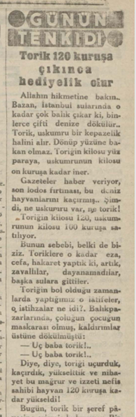 Bugün, torik bir şeref pâyesine erişmiş bulunuyor. Bir makam sahibidir. Bir servettir. Bir metadır. Bir inci tanesidir. Üç dört kiloluk bir toriği beş liradan aşağı alamazsınız. Bu nadide ve kıymetli maddeyi artık, evlerimizin en mutena köşesine alıp koyabiliriz.