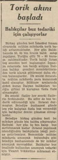 İtalya ile aramızdaki ticaret ve klering anlaşması nihayete erdiğinden bundan sonra takib edilecek hareket tarzı üzerinde temasta bulunmak üzere balıkçılar Ankaraya bir murahhas göndermişlerdir. Dün on dokuz bin çift torik tutulmuş ve bunların çifti 70 kuruştan satılmıştır.