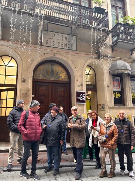 30 Kasım 2025 Saat 10:00’da Tünel’de buluşup, duayen İstanbul rehberimiz Ergican Acarbaş‘tan kulaklıklarımızı alıyoruz. İlk bilgi Tünel binasının hemen karşısında dikkatlerden uzak duran bir baca. 1875’te işleme alınan ve Karaköy ile Beyoğlu arasında çalışmaya başlayan Tünel ilk zamanlarında buharlı sistemle çalışıyordu. Bu fünikülerin buhar üretme binasının eskiden kalma bu bacası önünde resim çektiriyoruz.